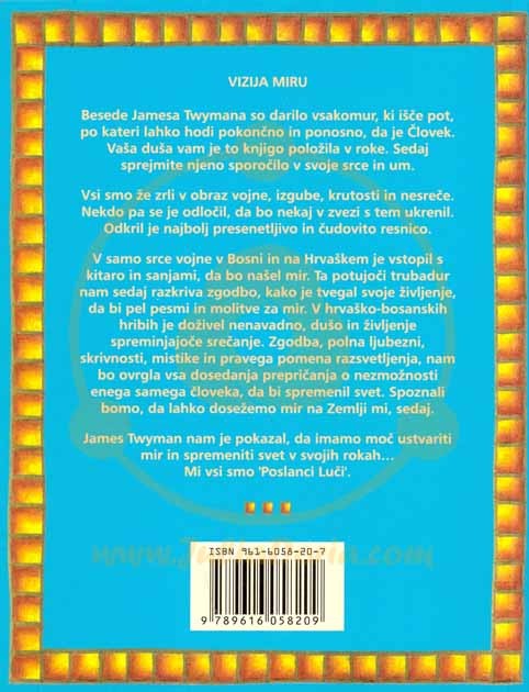 Gre za pripoved ameriškega avtorja Jamesa F. Twymana, ki je v naši neposredni bližini, v osrčju vojnih grozot, leta 1995 in 1996 - na Hrvaškem ter v Sarajevu in Medjugorju, doživel neverjetno izkušnjo brezpogojne ljubezni. Spoznal je, da je ljubezen vse in povsod, da je vse drugo iluzija - tudi tisto, čemur pravimo stvarnost. Vse to je doživel med vojno v skrivni skupnosti v hrvaških gorah, imenovani Poslanci luči. Poslanci luči so mistična skupnost, ki že tisočletja deluje v tajnosti ter prinaša mir v naš svet. Avtor je nekaj časa živel v tej skupnosti, s Poslanci meditiral in bil deležen izredno intenzivnega učenja.