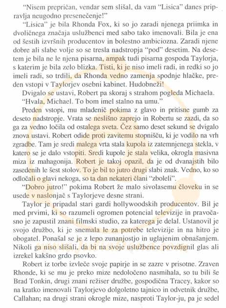 Robert iz torbe izvleče svoje papirje in se zazre v prisotne. Zraven Rhonde, ki se mu je preko mize nedoločeno nasmihala, so tu bili še Brad Tonkin, drugi znani režiser družbe, gospodična Tracey, kakor so na kratko imenovali Taylorjevo dolgoletno tajnico in odvetnik družbe, Callahan; na drugi strani okrogle mize, nasproti Taylor-ju, pa je sedel tretji slab znak tega jutra, Ron Goodman. On je bil izvršni producent velike televizijske mreže, za katero je Robert pravkar končal film. Namesto da bi mu pokimal z glavo, Robert podzavestno pogoltne slino. Začuti, da se mu je grlo nenadoma začelo sušiti.