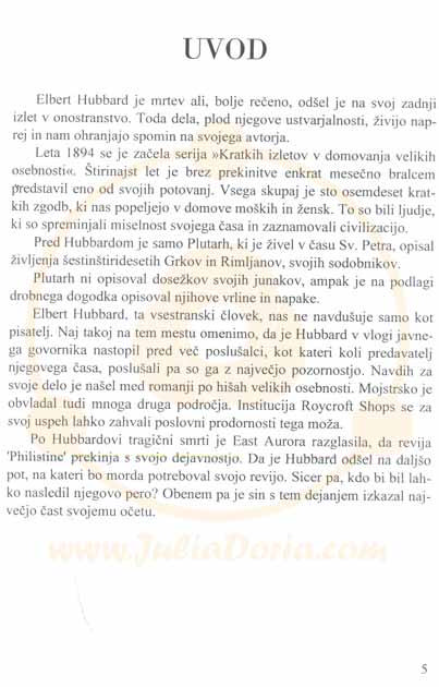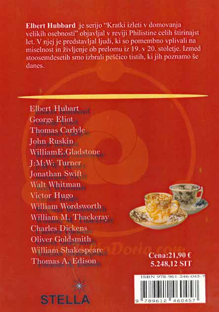 Opis vsebine:Elbert Hubbard je serijo “Kratki izleti v domovanja velikih osebnosti” objavljal v reviji Philistine celih štirinajst let. V njej je predstavljal ljudi, ki so pomembno vplivali na miselnost in življenje ob prelomu iz 19. v 20. stoletje. Izmed stoosemdesetih smo izbrali peščico tistih, ki jih poznamo še danes.