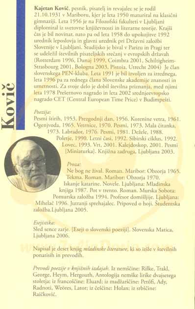 Akademik Kajetan Kovič, rojen leta 1931 v Mariboru, je eden najvidnejših povojnih slovenskih pesnikov in prevajalcev, pomembna pa je tudi njegova proza. Po diplomi iz primerjalne književnosti na ljubljanski filozofski fakulteti je bil nekaj časa novinar, nato pa urednik pri DZS.