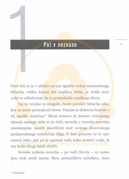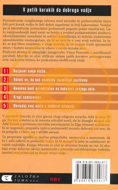 Poslovni strateg in olimpijski zmagovalec Vince Poscente v navdihujoči paraboli Mravlja in slon oblikuje sistem petih korakov premagovanja ovir, na katere trčimo, ko poskušamo slediti svoji viziji: