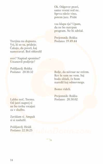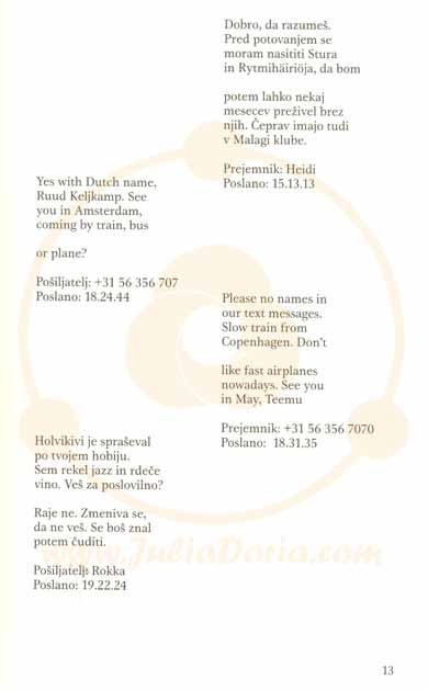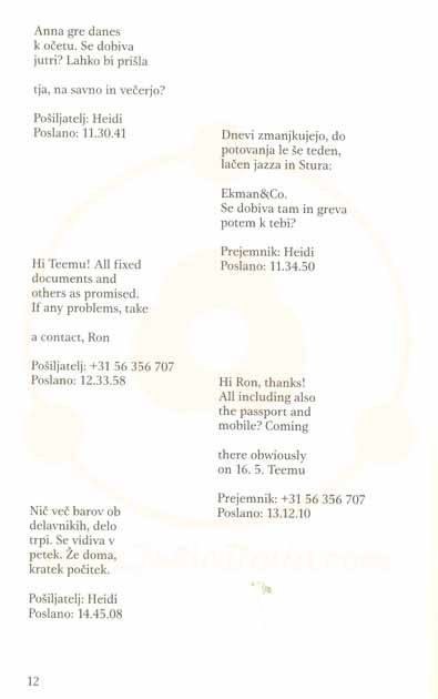 Opis vsebine:To je prva knjiga na svetu, ki je napisana izključno v obliki telefonskih sporočil. Sestavlja jo okoli tisoč sporočil, ki jih glavni junak prek mobilnega telefona izmenjuje s približno desetimi osebami. Glavni junak je Teemu Jokela, finančni direktor v vodilnem mednarodnem računalniškem podjetju, ki brez pravega pojasnila odpove službo in se odloči za potovanje z vlakom po Evropi.