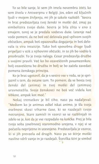 Pomiritev s seboj, sklepno dejanje po prehojeni poti, jo je pripeljalo do spoznanja, da so bile zmožnosti samo uresničitve, samo prepoznave, samo ozdravitve in umestitve v svet v njej že od nekdaj, le da so spale, prekrite s starimi usedlinami, še bolj pa z dogodki na poti, polni pasti in preizkušenj. In preizkušnje so jo iz dneva v dan približevale spoznanju, da je mogoče resnično vstopiti v življenje šele, ko se iskanje konča in se zaupljivo izročiš življenju.