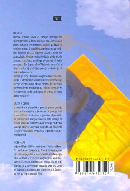 ![]() Opomba:Vreme pred 15 leti > Naslov izvirnika: Das Wetter vor 15 Jahren > Prevod: Urška P. Černe![]() Opis vsebine:Nemec Vittorio Kowalski zadnjih petnajst let spremlja vreme v daljni avstrijski vasi. Za vsak dan pozna nihanja temperature, količino padavin in sončnih minut. S čudaškim znanjem zmaga v oddaji Stavimo, da …? . Njegove strasti si nihče ne zna razložiti.