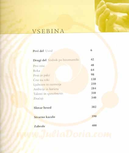V priročniku najdemo nazorne in slikovite opise štirih tipov rok in njihovih značilnosti - hribov na dlani, prstov in palcev ter glavnih in stranskih črt.