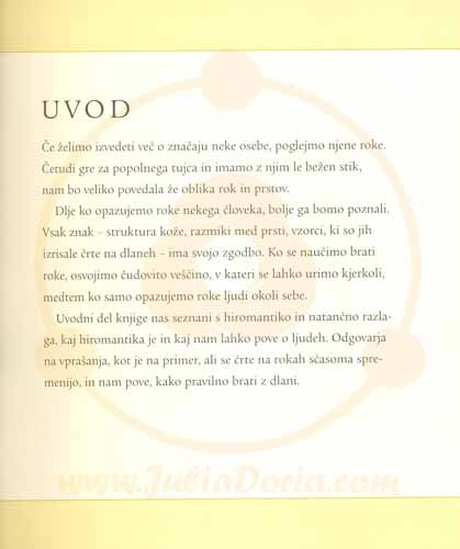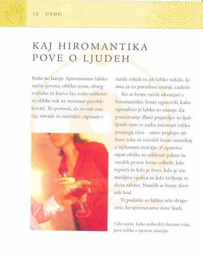 Ko znamo prepoznati in interpretirati različna znamenja na roki, spoznamo, da nam hiromantika lahko odpre vpogled v značaj, zdravje, razmerja in kariero. Naj gre za razumevanje človekovega nagnjenja k romantičnosti in strastnosti ali odkrivanje njegovih poklicnih potencialov, talentov in sposobnosti, priročnik nam bo v pomoč pri analizi lastne dlani kot pri proučevanju dlani prijateljev in družinskih članov. Četudi gre za popolnega tujca in imamo z njim le bežen stik, nam bo veliko povedala že oblika rok in prstov.
