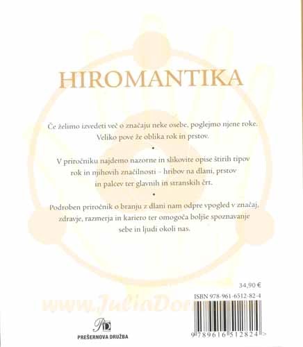 Pred nami je obsežen uvod v hiromantiko, s katerim se bomo naučili brati z dlani in odkrivati značaje ljudi okoli sebe. Priročnik z naslovom Hiromantika se začne z opisom štirih tipov rok in nas korak za korakom seznanja z značilnostmi roke. Mednje sodijo hribi na dlani, prsti in palci ter glavne in stranske črte.