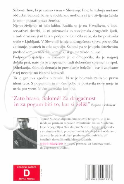 Opis vsebine:Iskrena izpoved o trpljenju, ljubezni in preobrazbi transseksualke Salome Ćuća Žentil