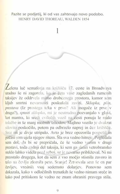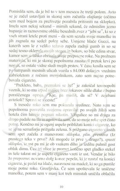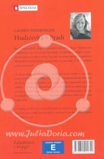 Ve, da je skrajno žaljivo, če v službi ne nosiš čevljev z najmanj osemcentimetrsko petko. Ve, da si z enainpetdesetimi kilogrami že debel. Ve, da lahko vse – taksi, obiske masažnih salonov, obleke – plačaš s službeno kartico, toda nikoli ne smeš zapustiti svoje pisalne mize ali dovoliti, da se Mirandina kava ohladi. In nikoli ne smeš ignorirati Mirandinega klica, tudi če te zbudi sredi noči.