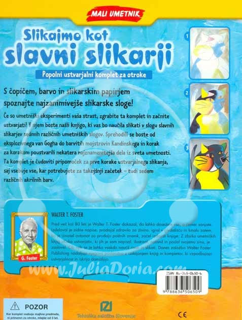 Če so umetniški eksperimenti vaša strast, zgrabite ta komplet in začnite ustvarjati! V njem boste našli knjigo, ki vas bo naučila slikati v slogu slavnih slikarjev sedmih različnih umetniških slogov. Sprehodili se boste od eksplozivnega van Gogha do barvitih mojstrovin Kandinskega in korak za korakom poustvarili nekatera najznamenitejša dela iz sveta umetnosti. Na tej poti se ne boste naučili le slikarskih metod in tehnik priznanih mojstrov, temveč boste odkrili tudi zanimiva dejstva vseh predstavljenih umetniških gibanj. Torej, hitro zgrabite čopič in si trdno namestite slikarsko čepico - čaka vas razburljivo potovanje skozi zgodovino umetnosti, ki ga ne boste nikoli pozabili!
