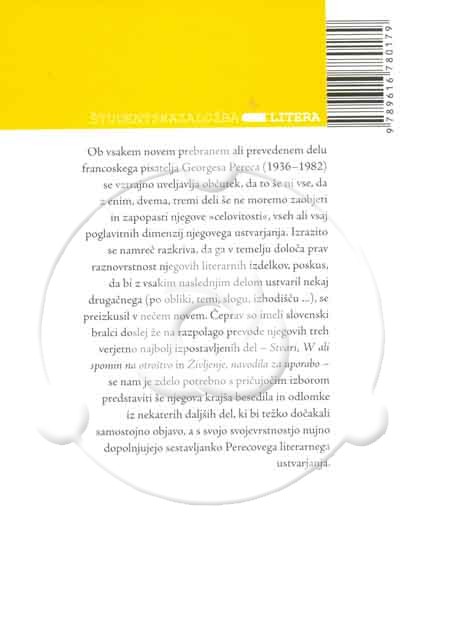 Opis vsebine:Ob vsakem novem prebranem ali prevedenem delu francoskega pisatelja Georgesa Pereca (1936-1982) se vztrajno uveljavlja občutek, da to še ni vse, da z enim, dvema, tremi deli še ne moremo zaobjeti in zapopasti njegove »celovitosti«, vseh ali vsaj poglavitnih dimenzij njegovega ustvarjanja. Izrazito se namreč razkriva, da ga v temelju določa prav raznovrstnost njegovih literarnih izdelkov, poskus, da bi z vsakim naslednjim delom ustvaril nekaj drugačnega (po obliki, temi, slogu, izhodišču ...), se preizkusil v nečem novem.