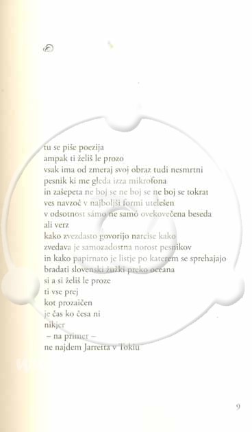 Ne-naivnost, kultiviranost izreke zna zagotoviti še kako drugače kakor z (kolikor bolj kričavim toliko bolj) jalovim zaklinjanjem veličin literarne zgodovine. Sploh pa je minilo že dolgo, odkar so se – čisto resno, brez ironije – v naši poeziji pojavili kraji, kot sta Lož ali Ruše. No, po drugi strani tudi skušnjavi po hladni, cerebralni abstrakciji prireže peruti – v zbirki je namreč vse polno besedil, ki nas povsem eksplicitno usmerjajo sèm; kolikokrat se vendar pesem začne s kazalnim zaimkom: tale.