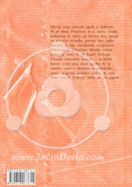 Opis vsebine:Glavna tema izbranih zgodb je ljubezen. Ni pa edina. Primešane so ji žalost, veselje, ljubosumje in strast, pa krivica brez upanja na pravično razsodbo, pravica brez sodbe, nesmisel in beg, osamljenost, razigranost, duhovnost in duhovitost, skratka vrtinec čustev in stanj, ki jih kopiči življenje.
