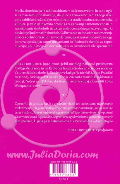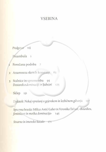 Opis vsebine:Opozoriti, da je tisto, kar je v zgodovini videti kot večno, samo učinkovanje ovekovečenja – ki ga udejanjajo vzajemno povezane institucije, kot so družina, cerkev, država, šola in v nekem drugem redu tudi šport in novinarstvo – pomeni, da se vnovič vstavi v zgodovino, se pravi vrne zgodovinskemu delovanju, razmerje med spoloma, ki jima ga je naturalistično in esencialistično videnje iztrgalo.